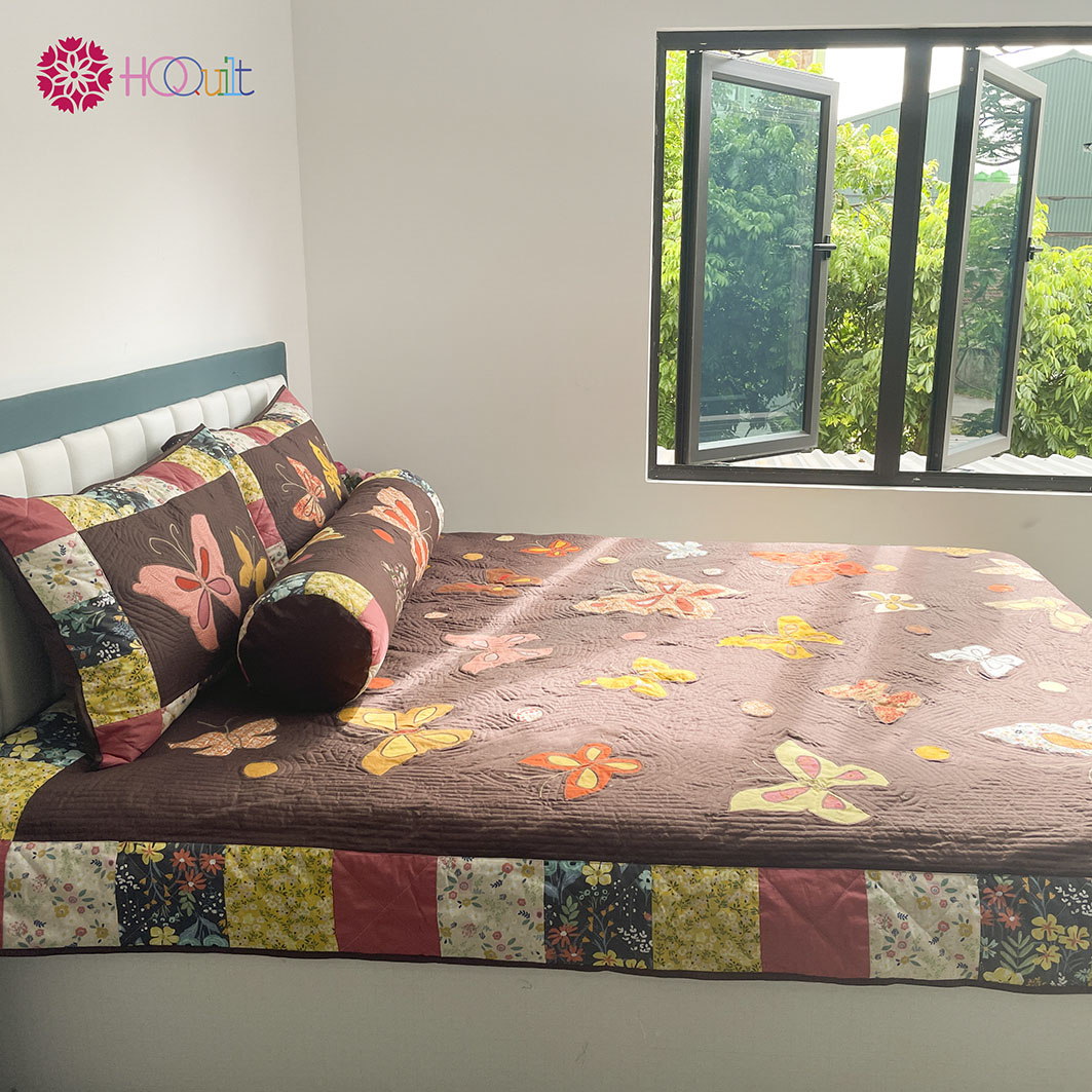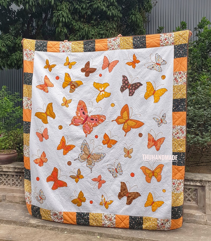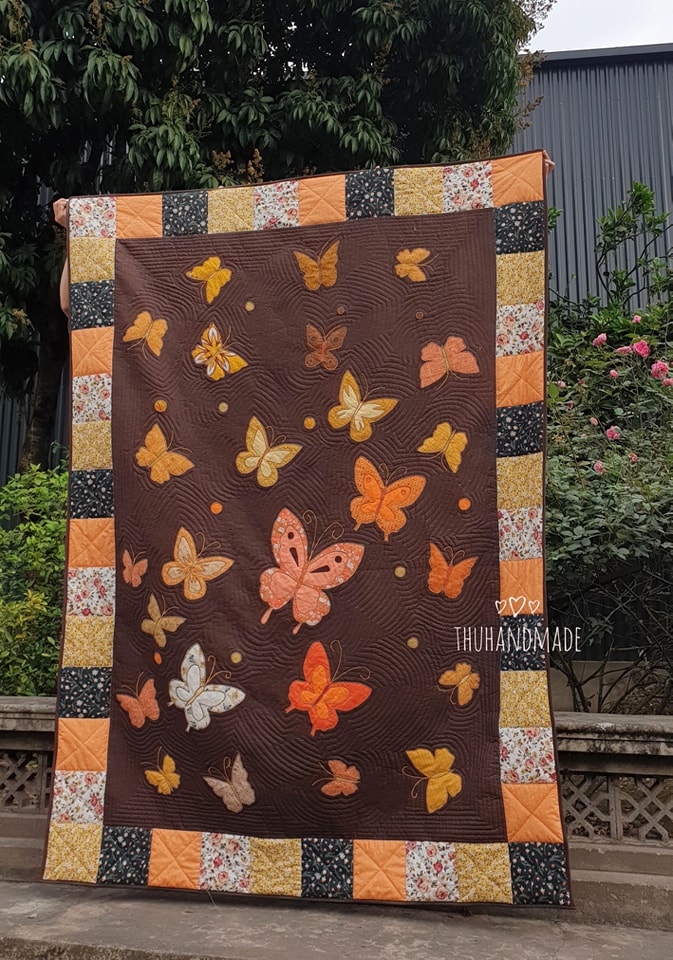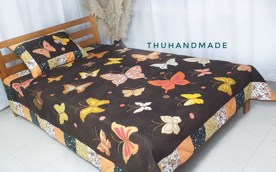 - Sản phẩm Quilt áp vải hình những chú bướm nhiều sắc thái (vàng, cam, be.v.v.), đang xập xòe cánh mỏng giữa nền chăn màu nâu trầm, gợi nên xúc cảm cực kỳ sâu lắng.