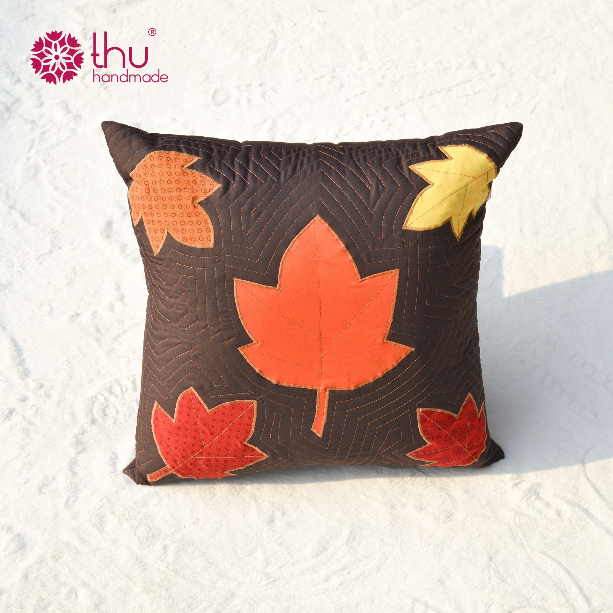 Mỗi chiếc lá đều được cắt may tỉ mỉ bằng kỹ thuật applique (áp vải) và quilting để viền chắc chắn, khiến từng chiếc lá trông như đang nhẹ rơi xuống một mặt đất yên bình. Đường may quilting chạy theo hình học rẽ nhánh lan tỏa từ tâm gối ra ngoài, như gợi nhắc đến vân gỗ hoặc làn sóng trong tự nhiên – vừa hiện đại vừa mộc mạc.