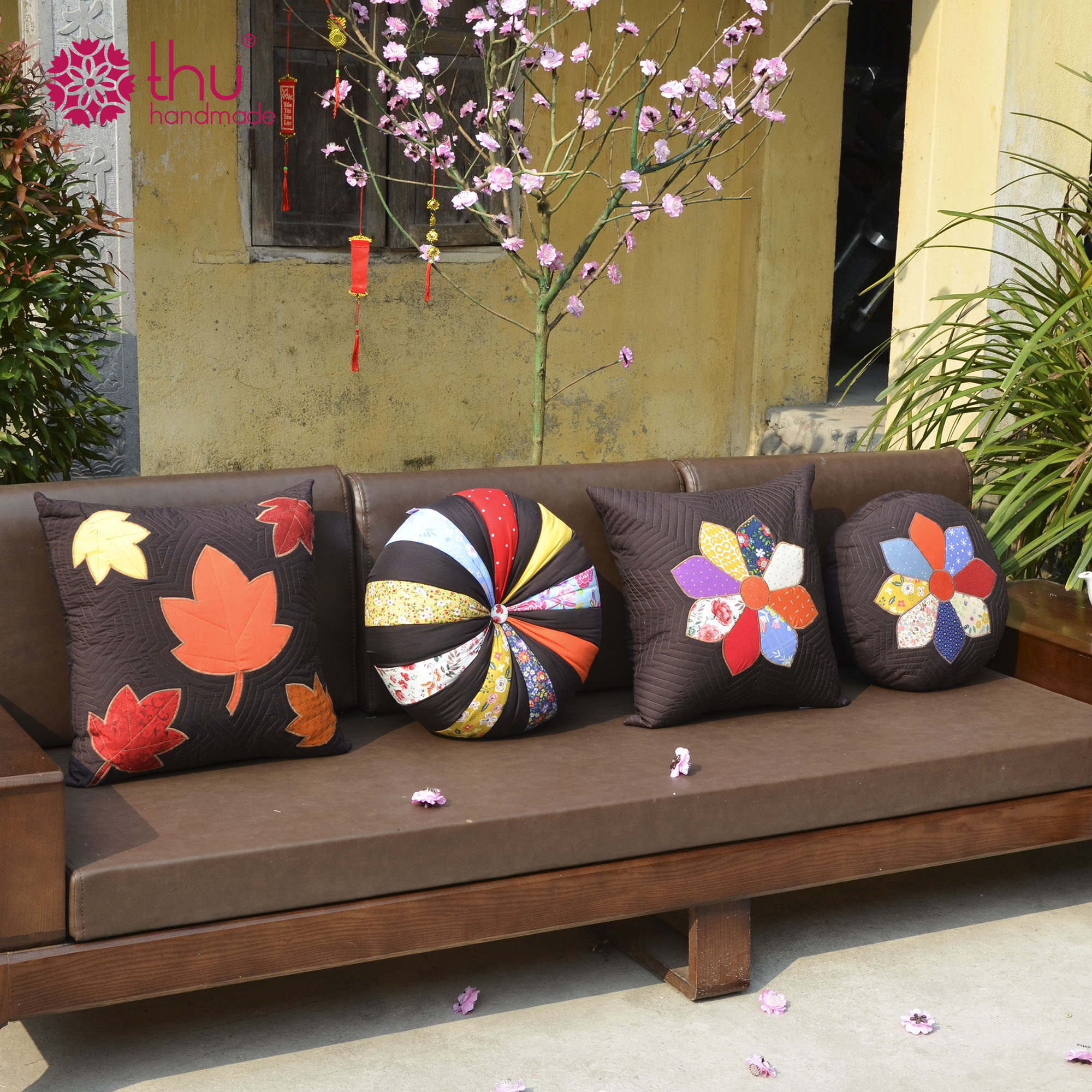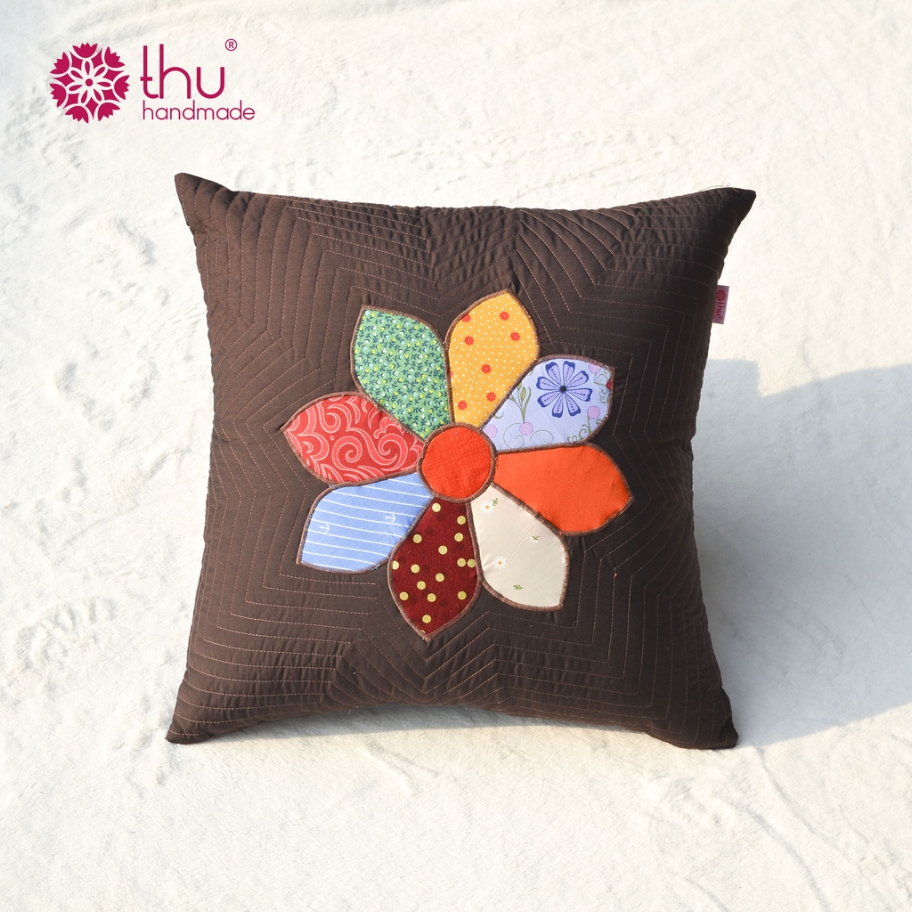 Chiếc gối này là một tác phẩm nghệ thuật sống động từ bàn tay của thợ thủ công Thu Handmade. Trên nền vải nâu sẫm ấm áp, họa tiết hoa sáu cánh bung nở rực rỡ ngay chính giữa như một điểm nhấn của sự sống và niềm vui. Mỗi cánh hoa được cắt may từ những mảnh vải khác nhau, kết hợp khéo léo giữa màu sắc và họa tiết . Tất cả như cùng hòa nhịp trong một bản nhạc sắc màu tươi vui.