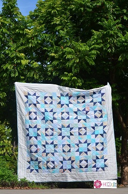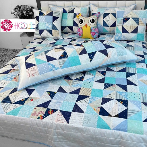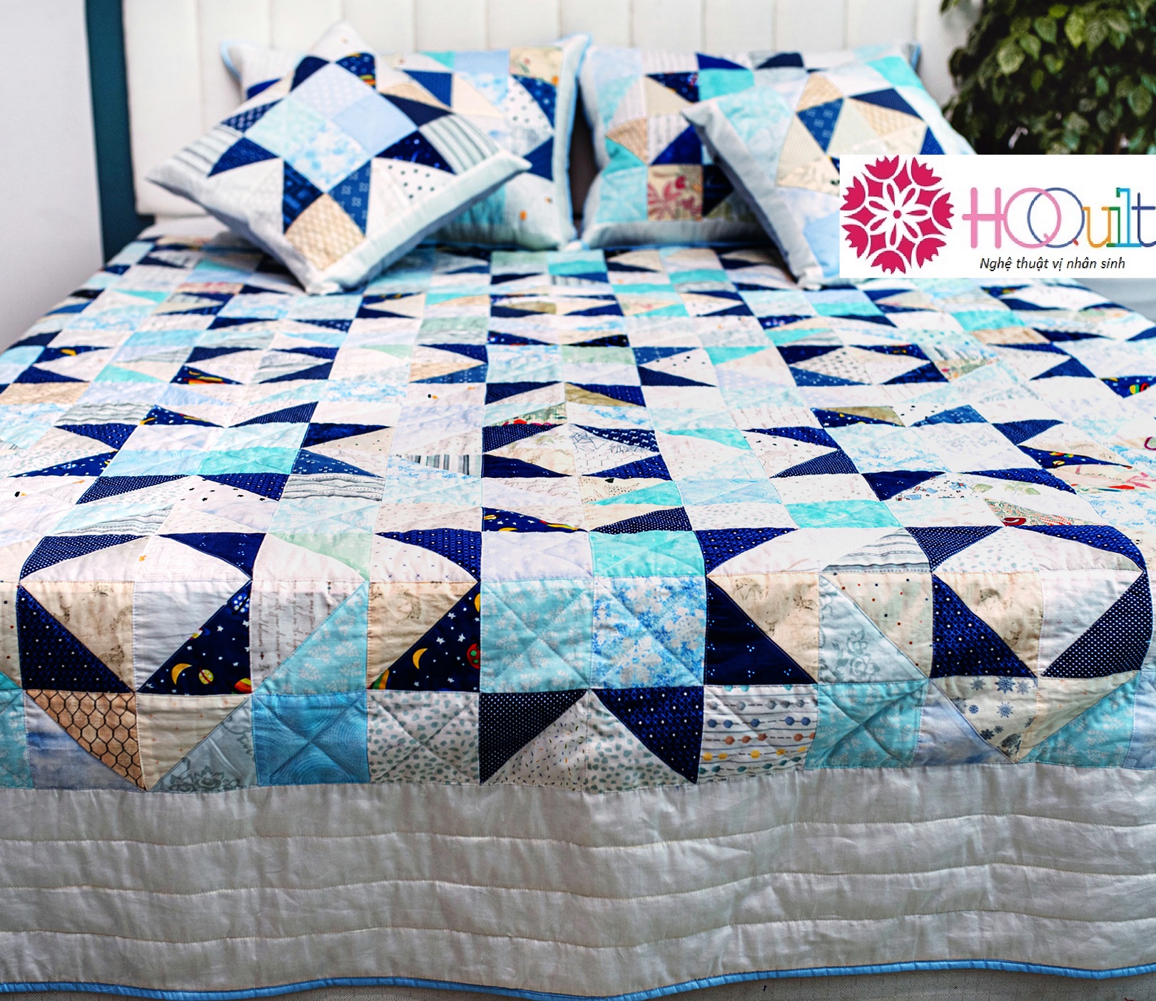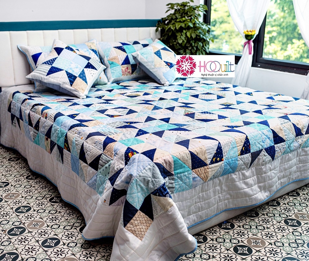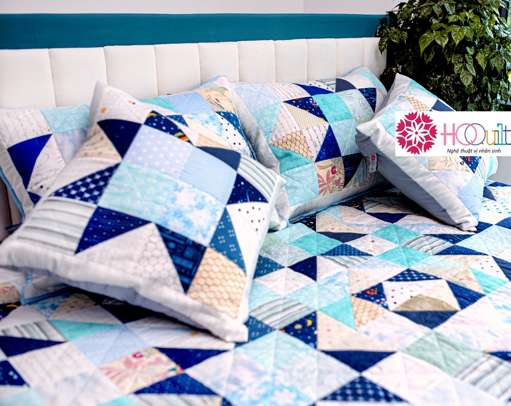 The First Happiness – Hạnh phúc thứ nhất. Đây là mẫu chăn đầu tiên được giới thiệu trong Bộ Sưu Tập mới của HQQuilt. Bộ sản phẩm được phối màu một cách nhẹ nhàng với điểm nhấn là các họa tiết màu xanh Cobal hai sắc độ - Cobal đậm và cobal nhạt (xanh dương) hiện lên nhẹ nhàng trên nền tranh với các ô màu trắng xen kẽ các ô màu be nhạt.