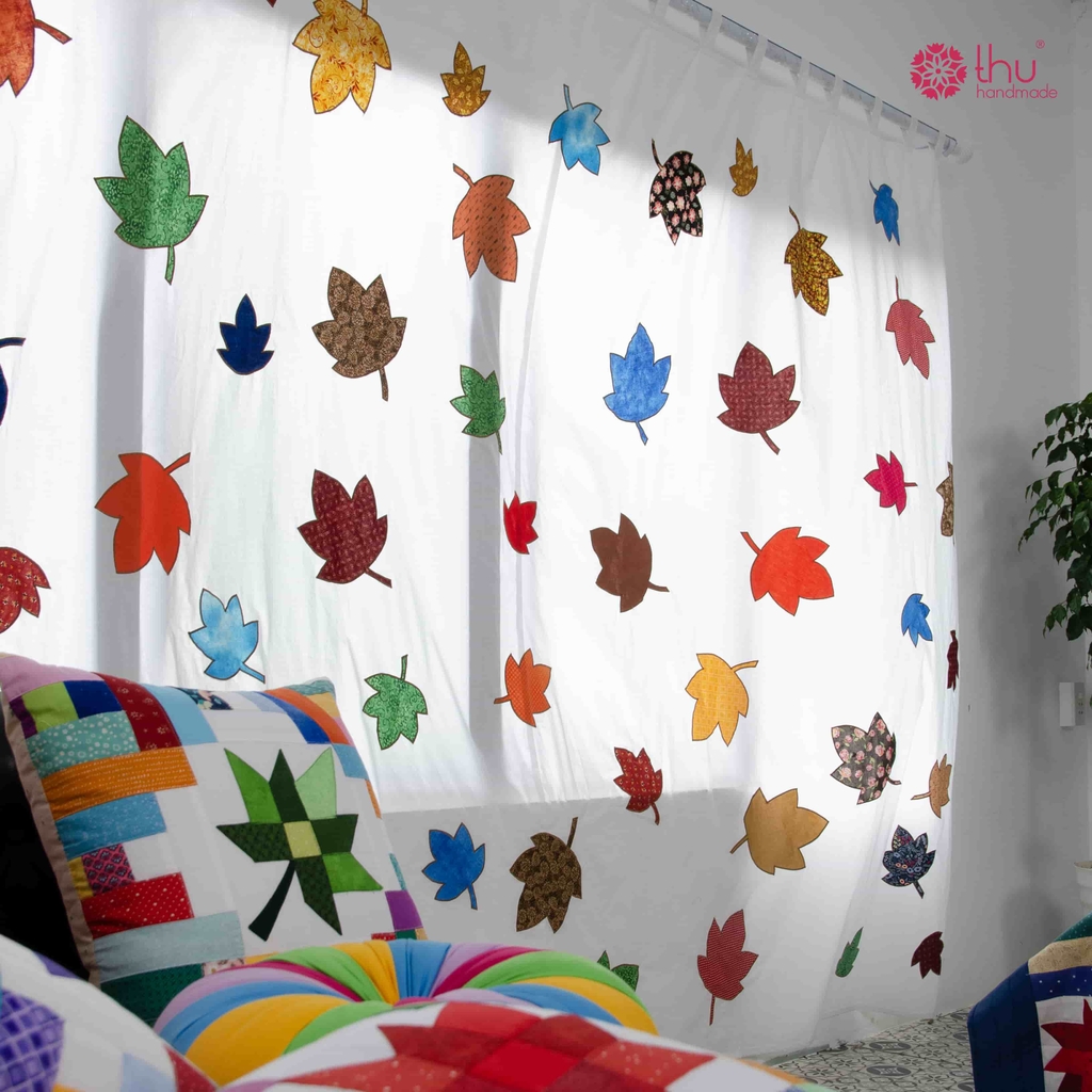 1. Tạo Không Gian Sống Thanh Lịch với Rèm Xuyên Sáng Quilt Áp Vải Hình Lá Phong Trên Nền Trắng