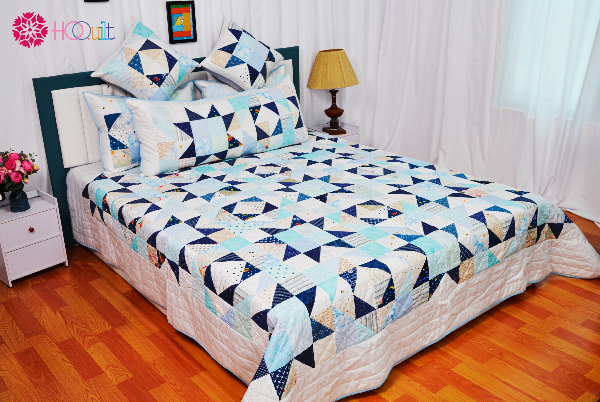 Tất cả những màu, sắc, hoạ tiết kể trên được HQQuilt bố cục trên một nền xanh cobal hoàn toàn nhất quán, xuyên suốt toàn bộ Bộ sưu tập, Bộ sản phẩm làm nên cái hồn, cốt căn bản cuả Happy Quilt.