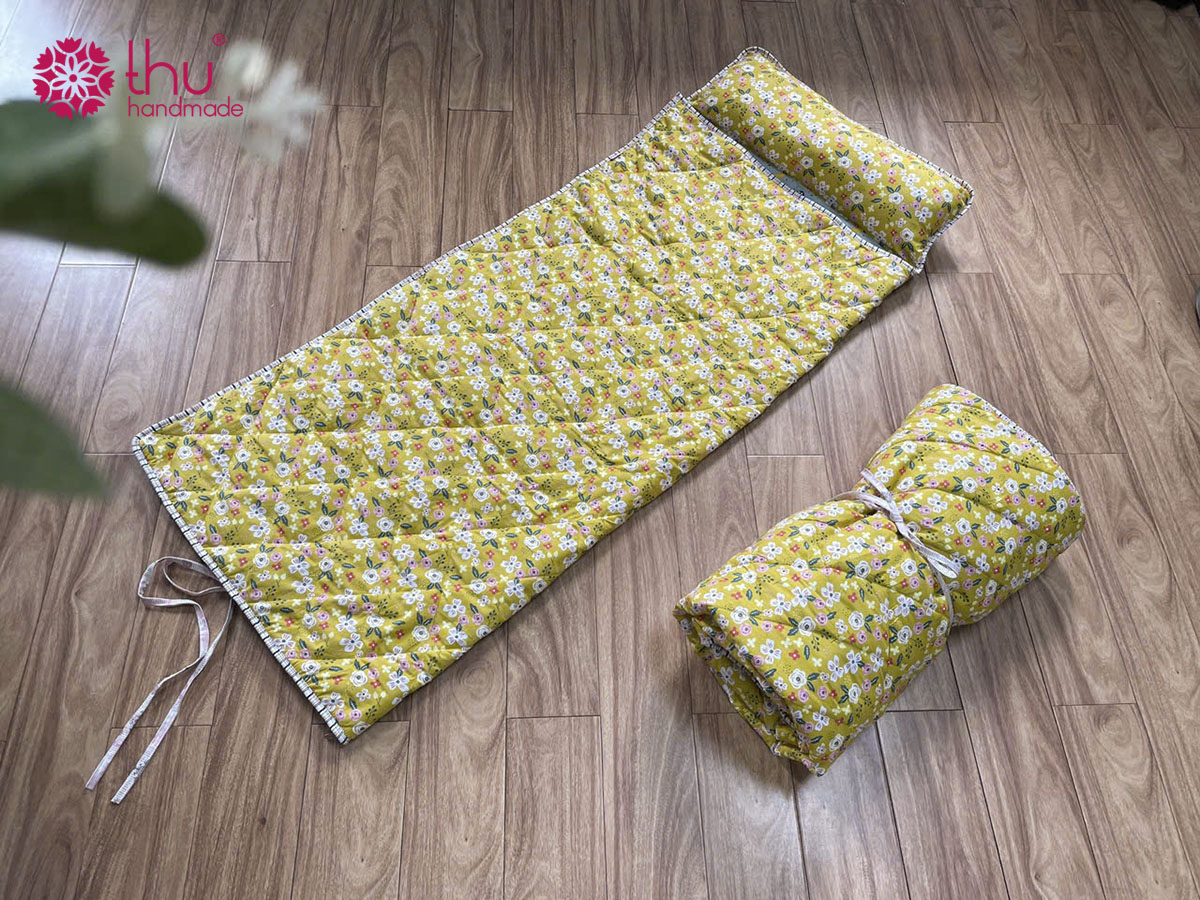 Mẫu túi ngủ họa tiết hoa vàng chần bông của Thu Handmade mang đến sự kết hợp giữa thiết kế tinh tế, chất liệu cao cấp và tính ứng dụng đa năng. Sản phẩm phù hợp với cả học sinh nghỉ ngơi tại trường bán trú và nhân viên văn phòng cần giấc ngủ ngắn để tái tạo năng lượng trong ngày làm việc.